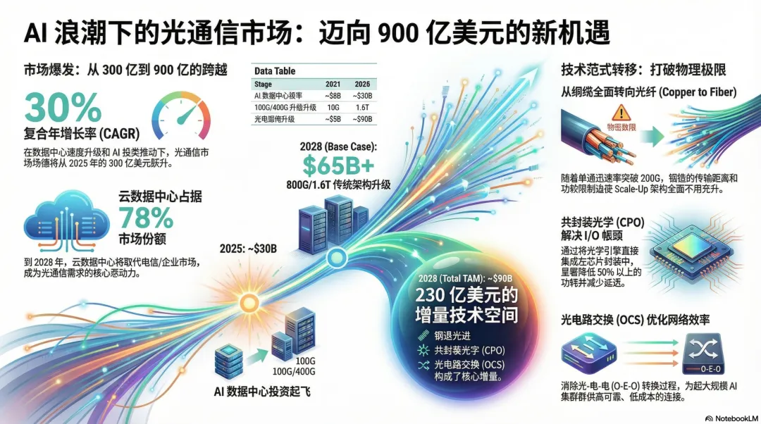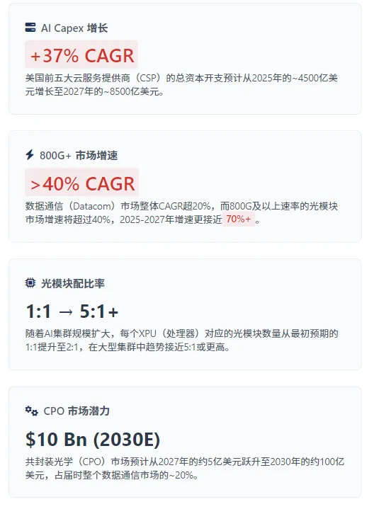 摩根大通报告开宗明义,给出了最具冲击力的宏观预测:全美前五大云服务提供商(CSP)的资本开支总额,预计将从2025年的约4500亿美元激增至2027年的约8500亿美元,年复合增长率高达37%。这笔天量投资的重点是AI基础设施,而网络与光通信正获得“公平且不断增长的份额”。一个关键指标“光模块与XPU(CPU/GPU等处理单元)的配比率”正在被大幅上修。最初的预期是1:1,但在大型AI集群中,这一比率已提升至2:1乃至5:1以上。这意味着算力增长对光互联的需求是非线性倍增的。市场规模的数据同样惊人。摩根大通引用LightCounting预测,数据中心光通信(Datacom)市场将从2025年的170亿美元增长至2030年的460亿美元,CAGR超过20%。其中,800G及以上速率的市场增速将超过40%的CAGR。摩根士丹利的预测同样激进,其基础情景下,光通信市场将从2025年的约300亿美元增长至2028年的650亿美元以上(CAGR约30%),若叠加新技术渗透,总市场规模(TAM)可接近900亿美元。核心结论:驱动因素已从传统的电信周期,彻底切换为AI驱动的云计算资本开支超级周期。光通信的“卖铲人”地位空前稳固,行业属性正在发生质变。主线二:技术变革前夜,新百亿美元市场浮现
