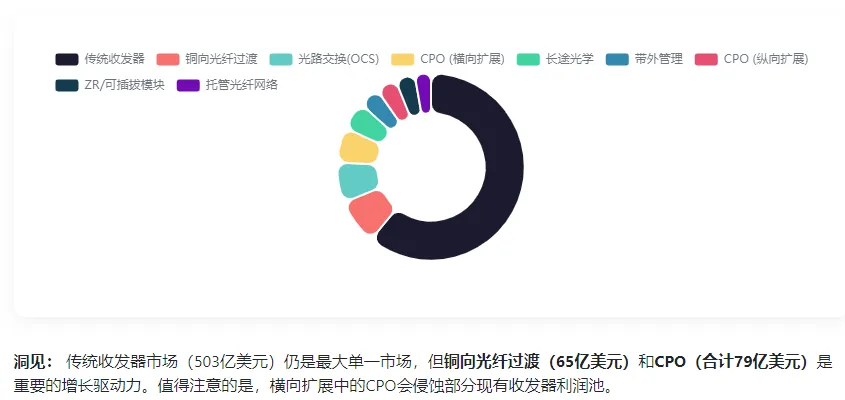 如果说当下的高景气度是“现在进行时”,那么技术的代际变革则定义了“未来时”。摩根士丹利的报告对此着墨更多,系统性地梳理了五大潜在新增量市场,合计规模约230亿美元:铜转光(Scale-Up):随着芯片互联带宽向TB/s级别迈进,机柜内、板级间的铜缆连接已达物理极限。未来,光纤将替代铜缆进入机柜内部,这不仅意味着数倍价值量的提升(光纤单价更高),更将带来光纤用量密度的大幅增加。报告估算,仅此一项就可能带来超过65亿美元的增量市场。共封装光学(CPO):这是最具颠覆性的方向。CPO将光引擎与计算芯片(如交换机ASIC)紧密结合,能极大降低功耗与延迟。报告区分了Scale-Up场景的CPO(解决芯片I/O瓶颈)和Scale-Out场景的CPO(替代可插拔光模块)。尽管面临成本、良率和生态不成熟的挑战,但CPO的商用已拉开序幕。摩根大通预测,CPO市场将从2027年的约5亿美元爆发式增长至2030年的约100亿美元。光电路交换(OCS):一种通过纯光信号进行路径切换的技术,能规避光电转换延迟,提升网络效率。谷歌已部署多年,未来可能在更大范围的AI集群中应用,带来约57亿美元的市场机会。带外管理网络:传统上使用低速铜缆和电交换机,Meta等厂商正与Ciena合作,转向基于无源光网络(PON)的方案,可节省大量空间与功耗,是一个约30亿美元的增量市场。电信与数据中心互联(DCI):伴随数据中心大规模建设,连接它们的长距离、高速光网络需求同步爆发。800G+、ZR可插拔等高端光器件将快速增长。核心结论:行业的技术天花板远未到来,一系列架构性创新正在打开新的价值空间。未来的赢家,必然是那些在传统领域有深厚积累,同时能率先卡位新技术的玩家。主线三:供应链博弈与定价权,谁在“戴着镣铐跳舞”?