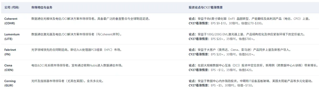 基于以上主线,两家投行为主要玩家勾勒了“牛市情景”下的画像,但侧重点与偏好已有分化:Coherent(相干):被摩根大通视为行业“全能冠军”。其在数通和电信光器件市场均处领先地位,拥有最广泛的产品组合、垂直整合能力以及横跨美、欧、亚的制造足迹。牛市情景下,2027年营收CAGR超20%,EPS可达9-10美元。Lumentum:被公认为激光器市场的领导者。摩根大通对其极为乐观,给出了2027年EPS 20美元以上、35倍PE对应780美元估值的牛市展望。然而,摩根士丹利表现出明显谨慎,认为其当前估值(近40倍2028年预期市盈率)已计入了利润率持续高企的完美预期,任何价格环境的松动都将带来巨大风险。Fabrinet:卓越的精密制造平台,深度绑定英伟达、Ciena等巨头。其角色是从行业繁荣中确定性受益的“卖水人”。摩根大通看好其同时承接多个大客户订单放量的能力。Ciena:电信与DCI光系统市场的王者,正积极向数通市场渗透。摩根士丹利特别指出了其与Meta合作的带外管理(DCOM)解决方案的独特增量价值。Corning(康宁):全球光纤光缆龙头。摩根士丹利明确将其列为长期最佳机会。逻辑在于:铜转光是确定性长趋势但尚未被充分定价(主要是2028年后的事件),康宁作为基础设施中的基础设施,其增长窗口和利润持续性可能更长,且当前估值相对其他光通信标的更具吸引力。总结:盛宴中的清醒思考