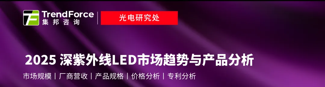另一方面,UV-C LED应用于杀菌净化,随着光学功率提升,也从消费性家电应用转向工商业表面杀菌与动态水杀菌客制化项目,多数厂商因此能维持产品报价。根据TrendForce集邦咨询调查,2026年可供应功率≥100mW的UV-C LED单晶封装厂商,包含ams OSRAM(艾迈斯欧司朗)、Nichia(日亚化学)、Violumas、NKFG(福机装)、UVT、LITEON(光宝)。