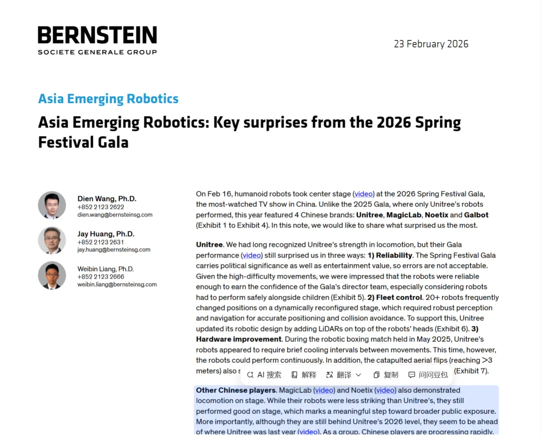 2026年2月23日伯恩斯坦发布的《亚洲新兴机器人:2026春晚关键惊喜》研报指出,本届春晚人形机器人表演成为核心亮点,中国本土四家品牌同台亮相的表现,不仅刷新了行业技术标杆,更标志着中国人形机器人产业实现集体突破,在核心技术与商业化落地层面已展现出对国际头部玩家的赶超潜力。