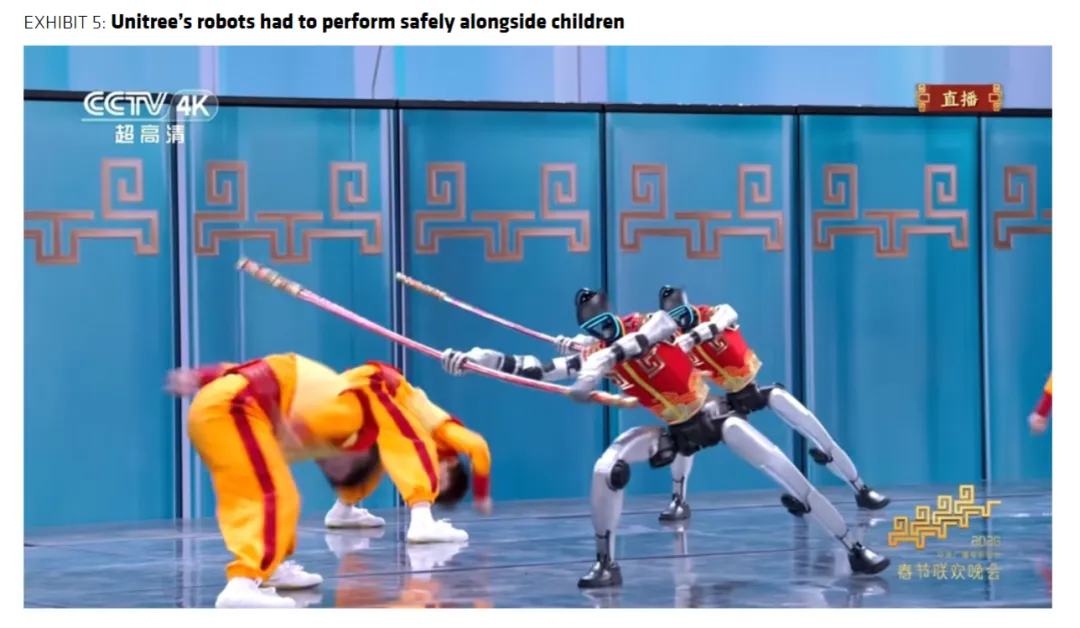 其他中国品牌的表现同样值得关注,MagicLab与Noetix虽在表现上稍逊于优必选,但均完成了舞台移动的核心展示,研报中Exhibit 2和Exhibit 3分别记录了二者的春晚表演画面,这一突破实现了品牌的大众曝光,更重要的是,二者当前技术水平已超越2025年的优必选,印证了中国人形机器人企业的集体快速进步。