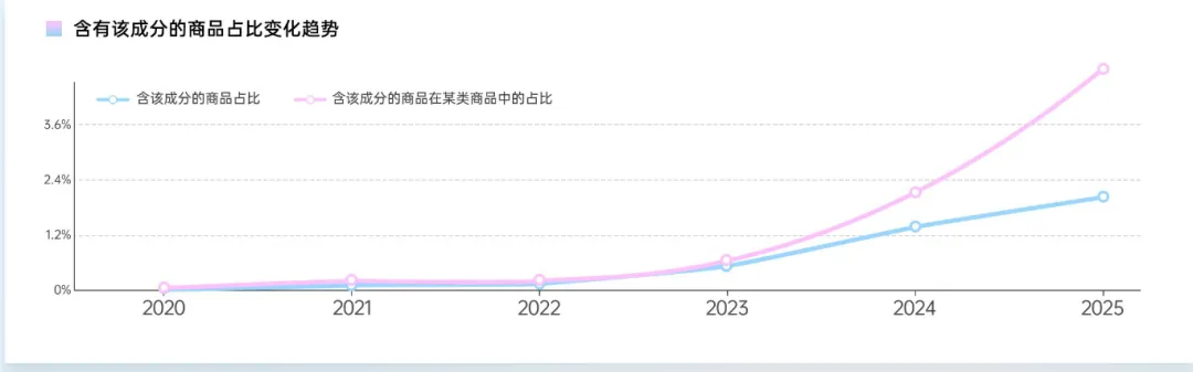 研报中多张核心图表直观展现PDRN的爆发态势,图1(研报P4):含有PDRN成分的商品占比变化趋势图,清晰呈现2016-2022年该成分商品占比平稳,2023年起呈爆发式增长,2025年在化妆品领域占比达2.0%、护肤领域达4.8%,印证了赛道的快速崛起;
