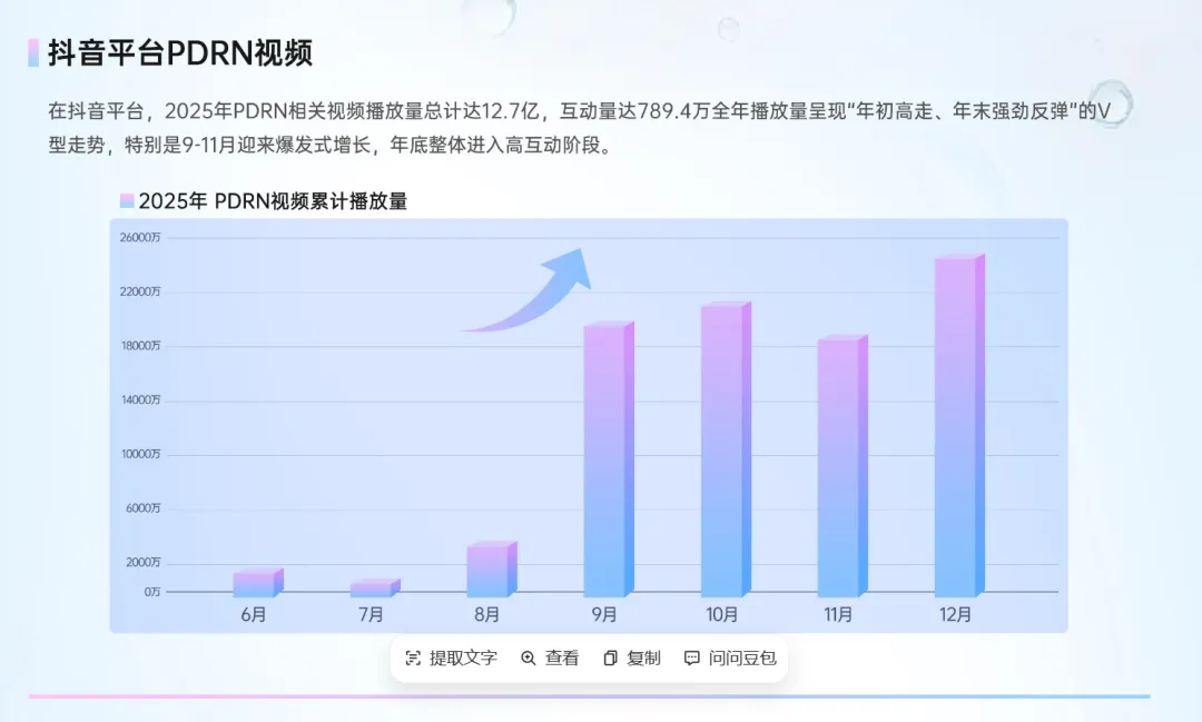 图2(研报P8):2025年PDRN视频累计播放量走势图,显示全年播放量呈V型走势,6-8月有所回落,9-11月迎来爆发式增长,年底进入高互动阶段,2025年相关视频总播放量达12.7亿、互动量789.4万,内容端热度拉满;