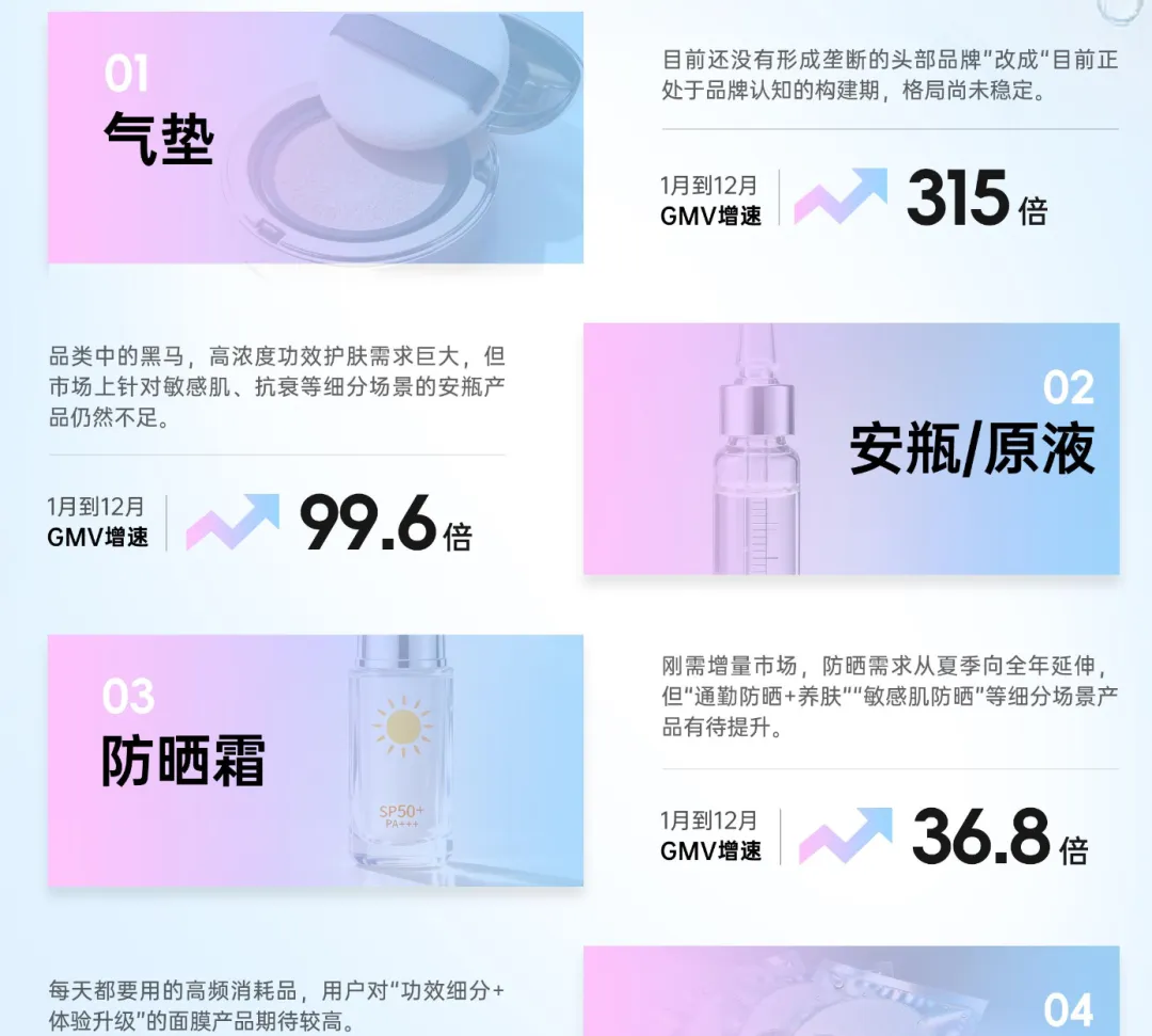 在抖音生态里,PDRN已经形成完整的消费闭环:2025年抖音该品类交易规模近30亿元,活跃消费者1.4亿,单均价164.8元,人均单量1.3次,用户粘性极高,核心消费群体为92.3%的女性,其中31-35岁白领/蓝领女性是主力。而赛道格局尚未稳定,气垫、安瓶/原液、防晒霜、面膜四大品类增速亮眼,分别达315倍、99.6倍、36.8倍、9.4倍,细分场景产品的缺失成为品牌新机会。
