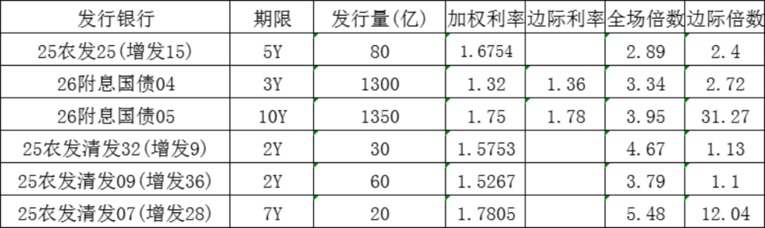 今日农业发展银行发行2年政策性金融债,发行量30亿元,发行利率1.5753%,投标倍数4.67倍,边际倍数1.13倍;农业发展银行发行2年政策性金融债,发行量60亿元,发行利率1.5267%,投标倍数3.79倍,边际倍数1.1倍;农业发展银行发行7年政策性金融债,发行量20亿元,发行利率1.7805%,投标倍数5.48倍,边际倍数12.04倍。