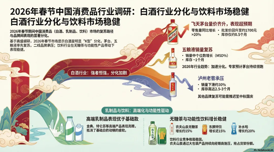 高盛研报-深度解析春节动销:茅台五粮液领衔复苏,消费分化已成定局高盛在春节假期后最新发布的专家调研纪要,揭示了丙午马年开年消费市场的真实温度。这份基于湖南某大型酒水食品经销商的电话会议记录,呈现出必需品赛道的冷热不均。复苏的路径已经开启,但这份温暖并非雨露均沾,而是高度集中在头部巨头手中,市场的分化正在急剧加速。