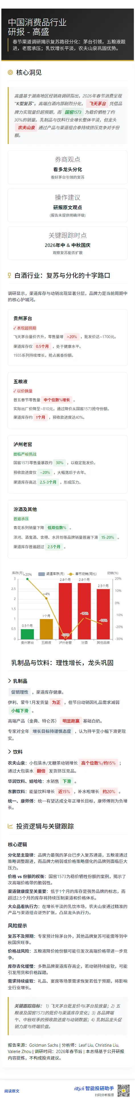 分化是全年关键词。无论是白酒、乳制品还是饮料,强者恒强、弱者承压的格局将进一步固化。投资必须精挑细选,不能再幻想板块性普涨。价格与库存是生命线。对于白酒,尤其是高端白酒,批发价的韧性远比短期增速更重要。健康的渠道库存(低于1个月)是品牌力的直接体现,而高库存(超过2.5个月)将严重压制后续业绩和估值。真实需求重于渠道压货。能够通过强大品牌力直接触达终端消费者(如茅台),或通过灵活价格策略刺激真实购买(如五粮液)的企业,才能在本轮复苏中占据主动。单纯依靠向经销商压货的模式已经难以为继。全年拐点判断。高盛专家预计,茅台有望在2026年中左右触底反弹,而其他品牌可能需要等到中秋国庆旺季才能看到更明确的复苏信号。这为市场预期提供了一个大致的“时间地图”。马年的开局,消费市场没有迎来酣畅淋漓的“开门红”,却给出了一份更真实、更精细的“体检报告”。它告诉我们,盲目乐观与全面悲观都不可取。真正的机会,藏在那些品牌壁垒最深、渠道最健康、且有能力在存量中夺取份额的龙头公司身上。
