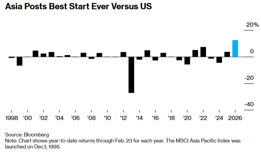 就如上图所示的那样,亚洲股市相对美国股市创下史上最佳开局,图表展示截至2月23日的各年度年初至今收益率。MSCI亚太指数于1998年12月1日推出。