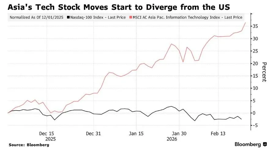 “亚洲的头部科技类股票,比如台积电、三星与SK海力士,都是全球科技巨头们AI支出不断攀升的最直接受益者,”来自Union Bancaire Privee驻新加坡的董事总经理Vey-Sern Ling表示。“AI恐慌交易真正意义上是从软件股大抛售开始的,而全球大多数知名软件公司都在美国股票市场上市。”