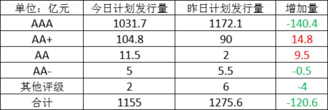 今日存单计划发行量规模1155亿元,较上一工作日计划发行量有所减少,减少了120.6亿元。
