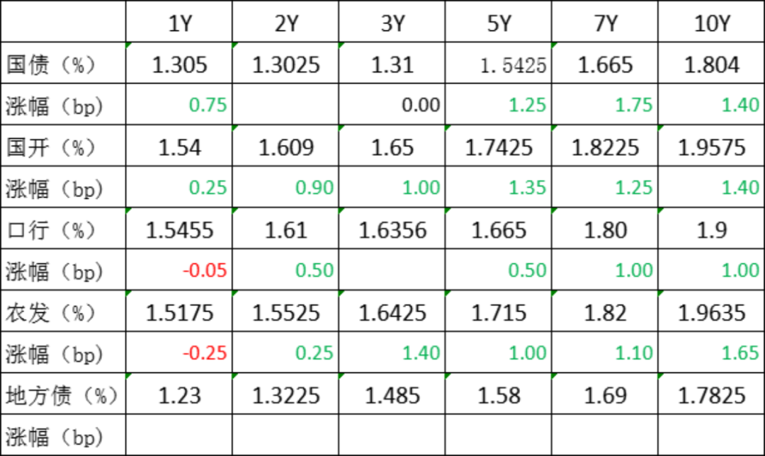 截止17:15,利率债二级市场中,利率成交价格总体呈上涨趋势,其中上涨程度较大的有7年期国债,收益率上涨1.75bp,报1.665%;10年期农发债,收益率上涨1.65bp,报1.9635%;10年期国开债,收益率上涨1.4bp,报1.9575%,10年期国债,收益率上涨1.4bp,报804%。