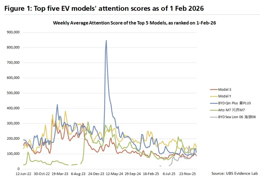 需求侧:高基数与透支效应。过去几年电动车渗透率从个位数飙升至40%以上,实现了惊人的跨越。高增长背后必然有需求的提前释放。当渗透率进入中高位平台期,增长自然放缓。瑞银的证据实验室数据也显示,消费者对新兴电动车品牌的关注度趋于平缓。供给侧:原材料成本的“回马枪”。电池级碳酸锂的现货价格,在2月24日报每吨15.2万元人民币,虽然环比微降5%,但同比暴涨了105%,比三个月前也涨了64%。这意味着,车企在2025年享受了一段时间的成本红利后,再次面临巨大的电池原材料成本上涨压力。这对本已因价格战而脆弱的整车毛利率,构成了直接威胁。三、产业链的连锁反应:冰火两重天
