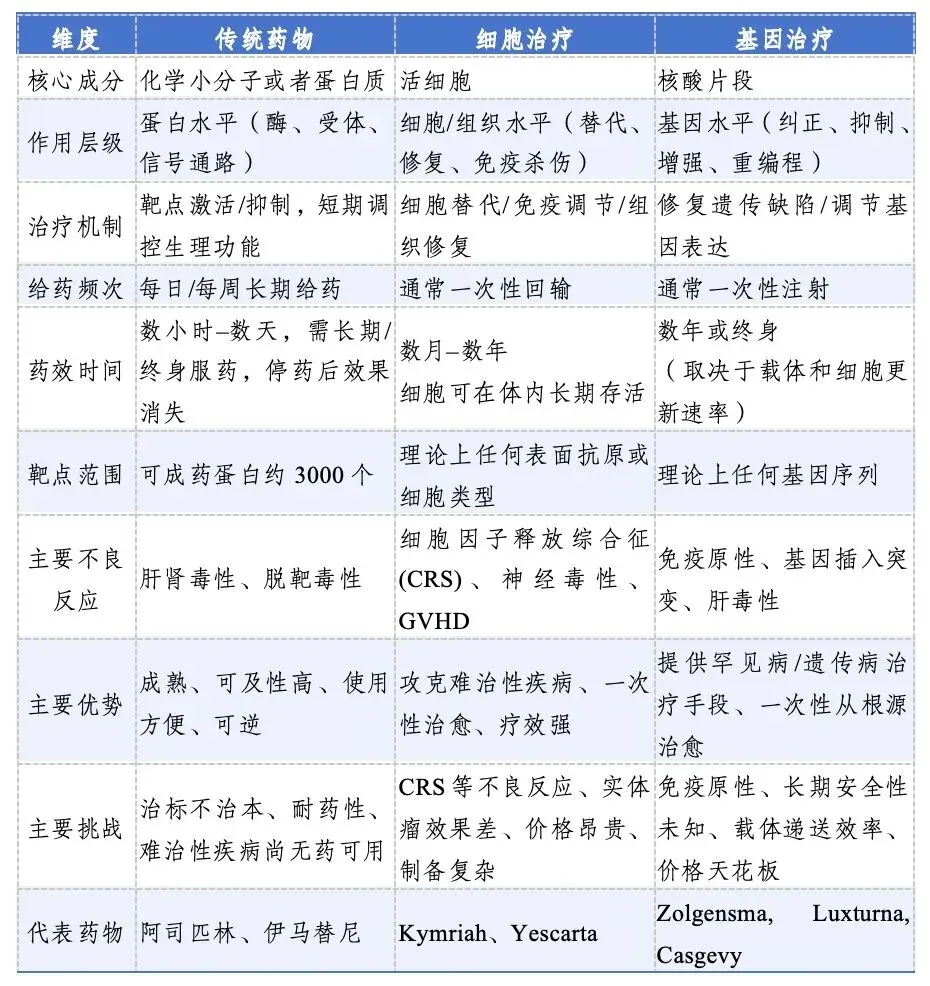 CGT疗法由于革命性地采用了靶向细胞或者基因的治疗手段,与传统治疗药物和治疗技术有着本质的区别,主要集中在以下维度。
