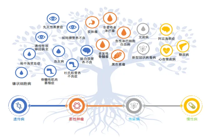 基于CGT一次性给药、根源性治愈的优点,该疗法在难治性疾病领域具有重要的应用价值。例如白血病、肝癌等恶性肿瘤,血友病、遗传性视网膜黄斑病变等遗传病/罕见病,糖尿病、心血管疾病、神经退行性疾病、自身免疫等慢性病。