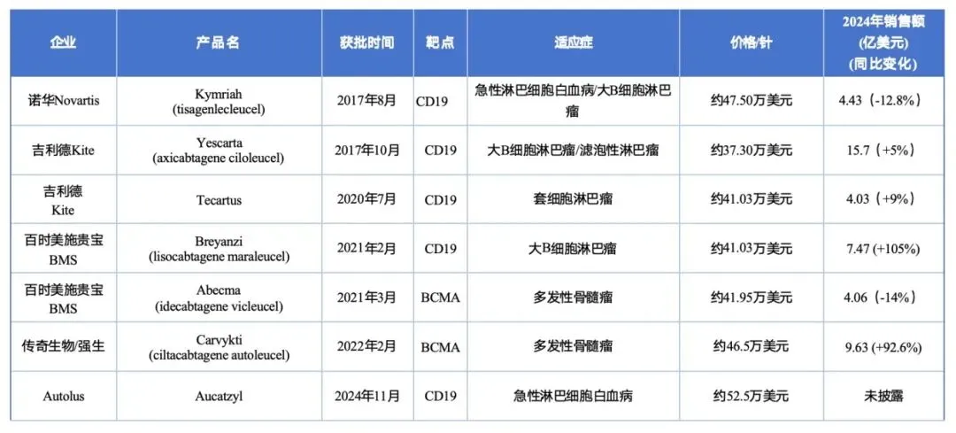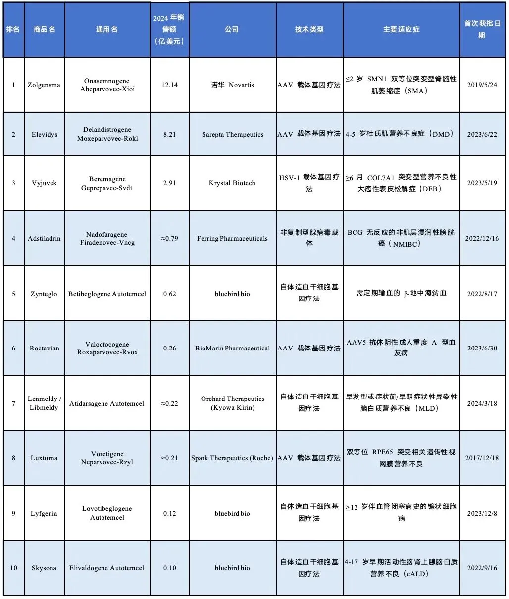 细胞与基因治疗(CGT)具有靶向疾病根源、一次治疗长期有效等特点,正逐步突破传统治疗手段的局限,在末线恶性肿瘤、罕见病、慢性病、神经退行性疾病等难治性疾病具有显著优势。吉利德CAR-T产品Yescarta、传奇生物CAR-T产品Carvykti、百时美CAR-T产品Breyanzi、诺华AAV基因疗法Zolgensma等明星产品2024年销售额均超10亿元,充分展现出CGT领域的巨大市场潜力。