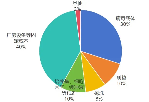 影响CGT生产成本最大的两项因素是产能利用率和病毒载体成本。提升生产规模和降低病毒载体的成本是降低产业生产成本有效的方式,同时可通过国产替代、技术升级等方式进一步降低单位成本。根据《Internationaljournal of cancer》研究,生产单人份CAR-T细胞成本约为8万美元。其中成本最多的是培养及转导 CAR-T所用的质粒、病毒载体等耗材,占比约 60%,其余约 40%为厂房设备等固定成本。