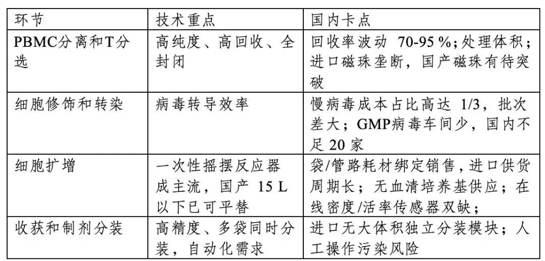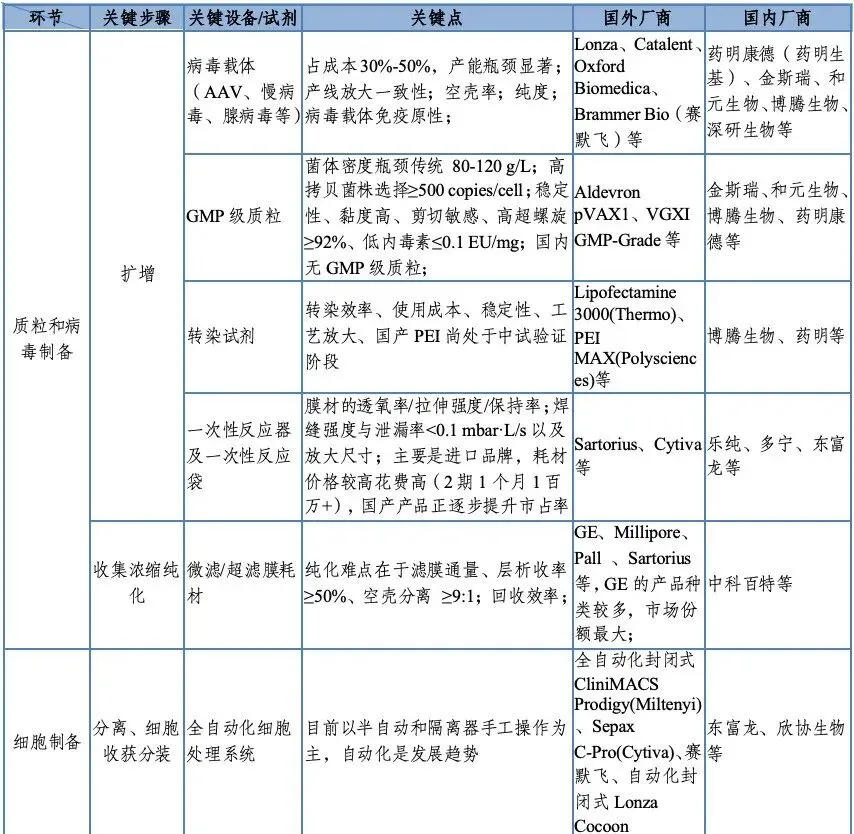 国内CGT产业起步较晚,部分中高端装备与耗材仍然以进口为主,制造所需的许多关键组件,如病毒载体、质粒、细胞培养基等大多依赖进口,国产厂商正积极布局,逐步打开进口替代空间。