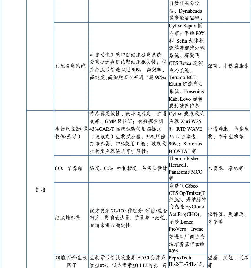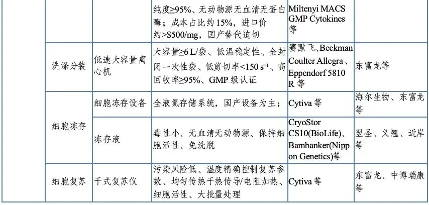 国产替代加速降本效应的上游核心材料及设备供应商:原材料端的国产替代已具备现实驱动,建议关注国产替代速度较快的无血清培养基、细胞因子、纯化填料、分选磁珠、冷冻离心机等,具备覆盖CGT主流程节点较完整多品类产品线、产能布局已初步形成、已完成关键工艺节点验证或取得NMPA/FDA注册备案资质的耗材或设备企业。