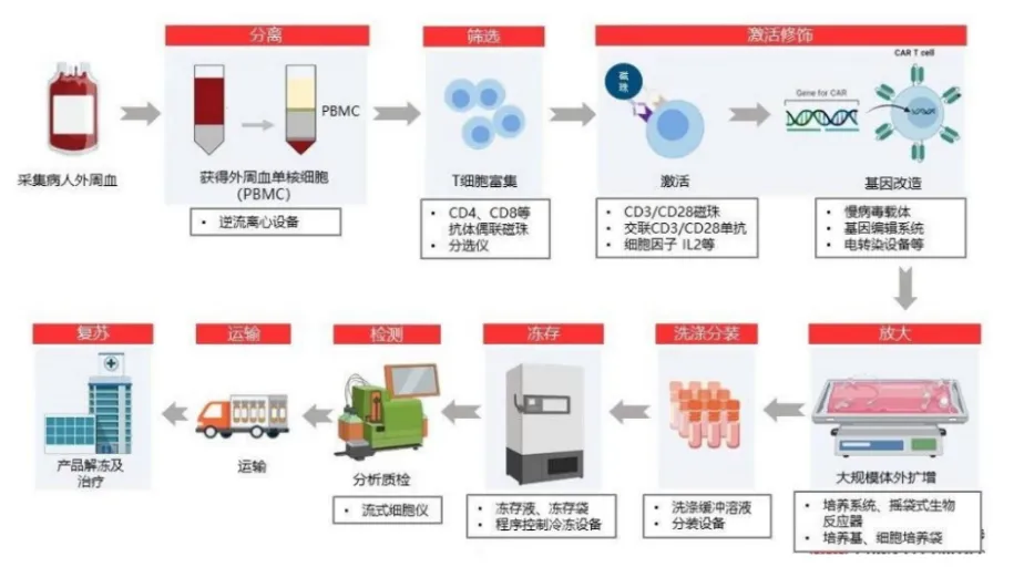 CAR-T生产过程通常包括PBMC分离与T细胞分选、T细胞激活、细胞修饰与转染、细胞扩增以及细胞收获和制剂分装五大环节。