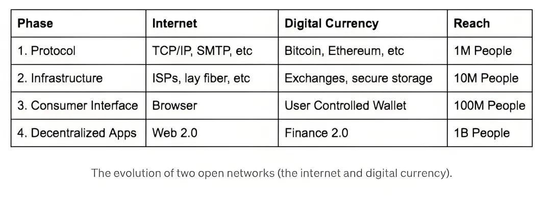 按照此前该团队的规划,这一目标需要通过四个阶段来逐步实现:底层开发协议、基础设施建设、用户入口搭建以及原生应用生态的成型。伴随着这四个阶段的推进,Coinbase 的用户群体也将呈现规模级扩张。