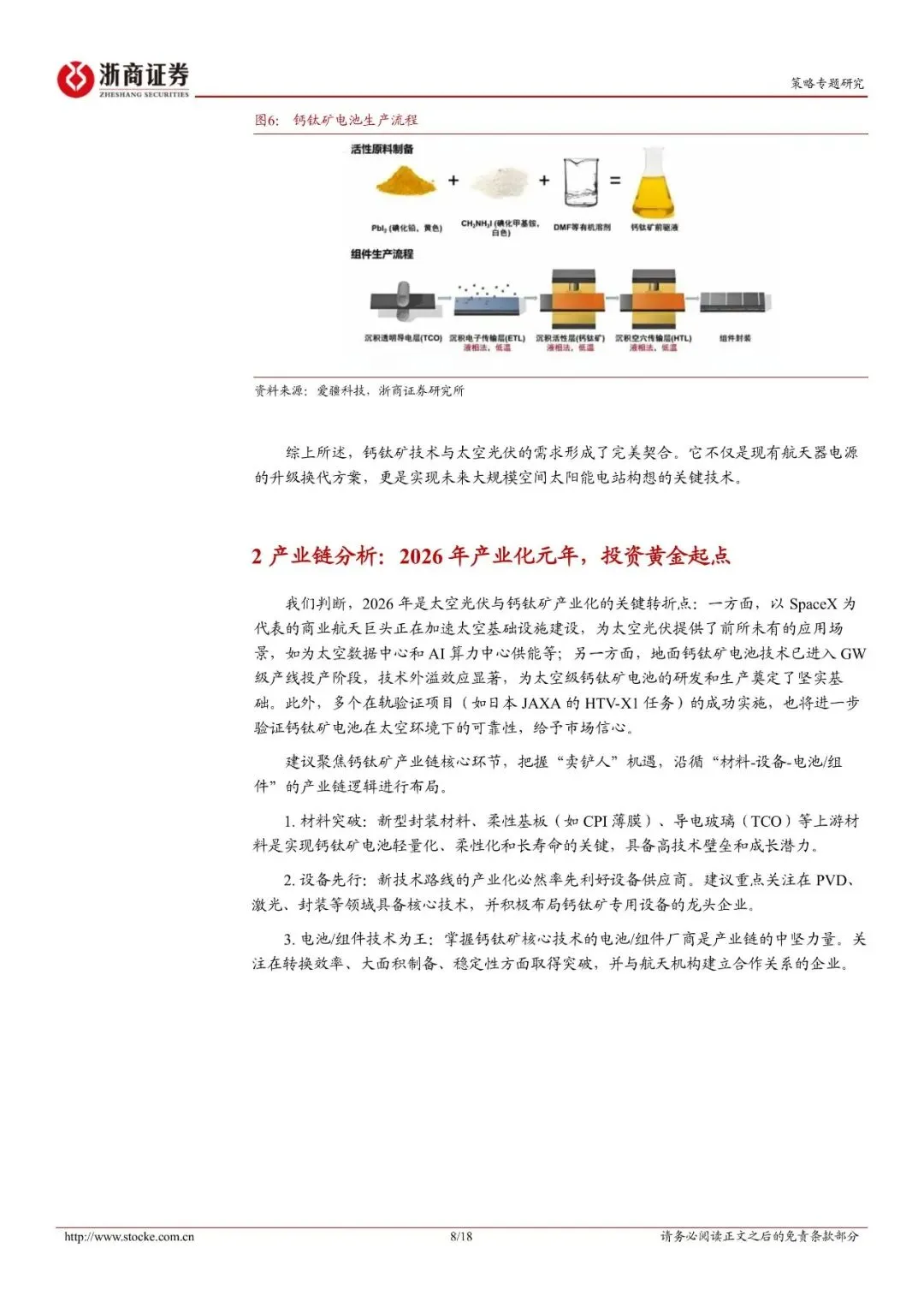 以SpaceX为代表的商业航天巨头加速太空基础设施建设,为太空光伏提供了前所未有的应用场景。同时,地面钙钛矿电池技术已进入GW级产线投产阶段,技术外溢效应显著,为太空级钙钛矿电池的研发和生产奠定了坚实基础。钙钛矿产业链的核心环节包括材料、设备和电池/组件,其中材料突破(如新型封装材料、柔性基板、导电玻璃等)、设备先行(如PVD、激光、封装设备等)以及电池/组件技术为王(如转换效率、大面积制备、稳定性等)是投资的重点方向。建议投资者关注掌握核心技术、具备高成长潜力的企业,以及与航天机构建立合作关系的企业,以分享钙钛矿产业化带来的红利。