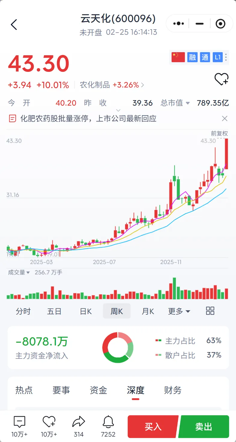 主线核心,止损-8%,目标+15-20%。 - 云天化: