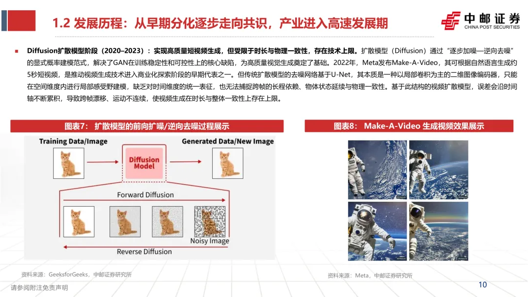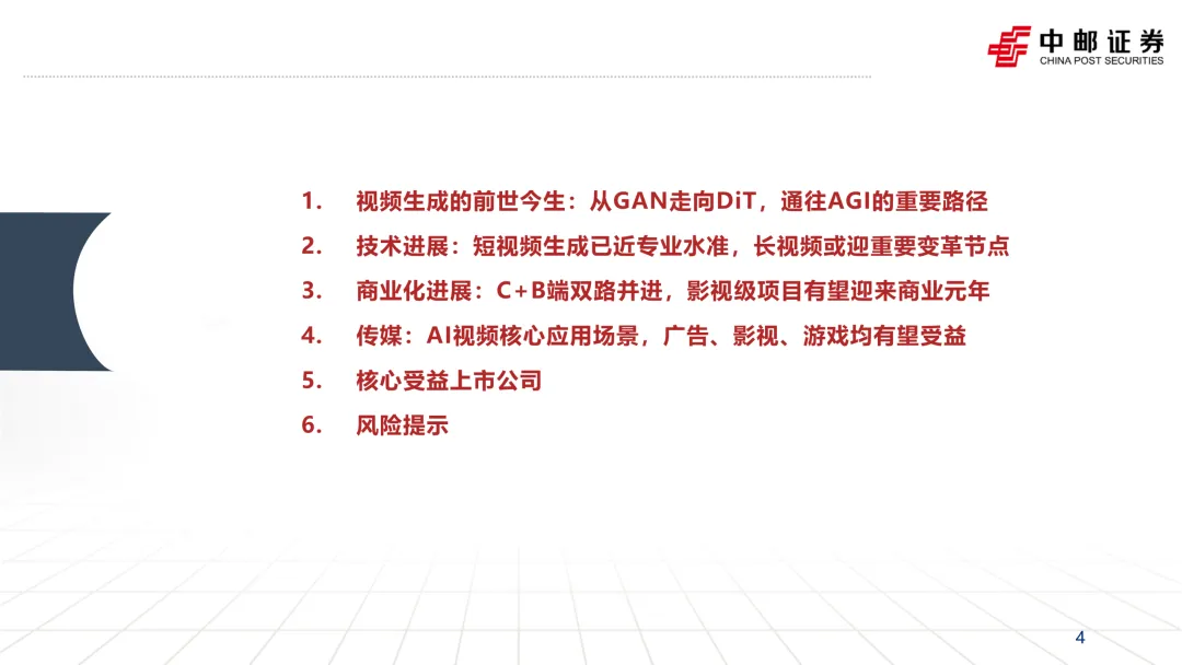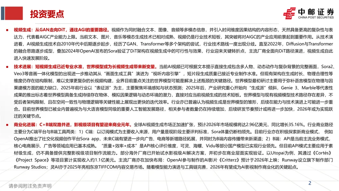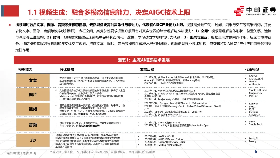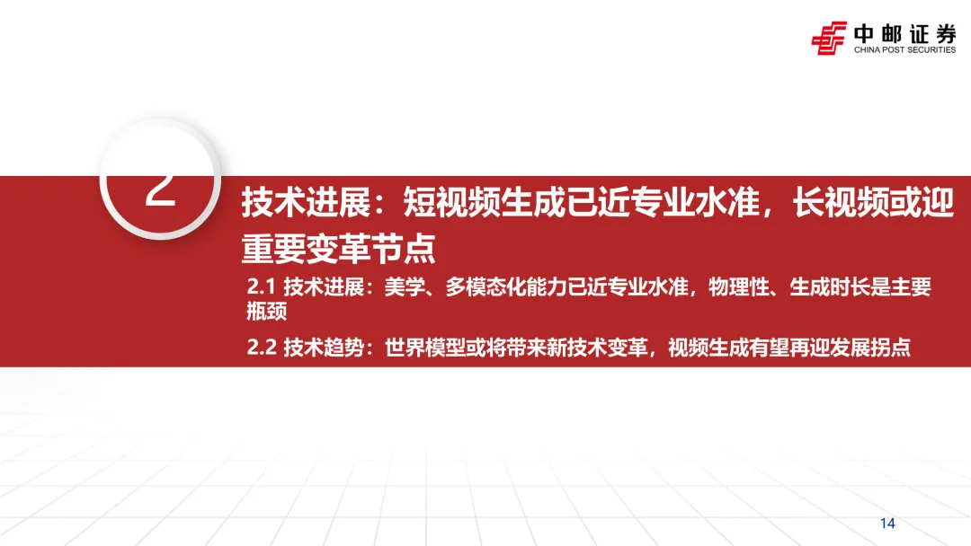 研报的判断很明确:短片段生成已经接近专业制作水准,尤其是在“文本提示→生成包含人物动作与复杂背景的画面”这类任务上。