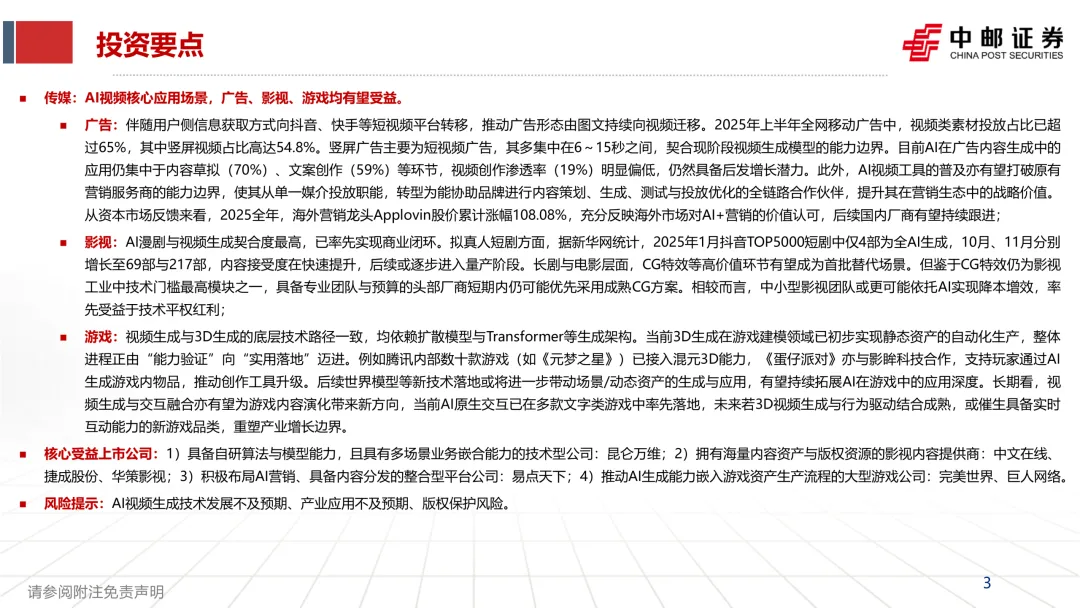 • 广告:短视频平台崛起推动广告素材视频化,竖屏短片段正好匹配现阶段模型能力边界;视频创作渗透率仍低,空间大。 • 影视:AI 漫剧与短剧更容易闭环;长剧/电影则可能先从 CG 特效等高价值环节切入,中小团队更可能先受益。 • 游戏:与 3D 生成底层技术路径相近,未来与世界模型/交互融合,可能打开更长期的想象空间。