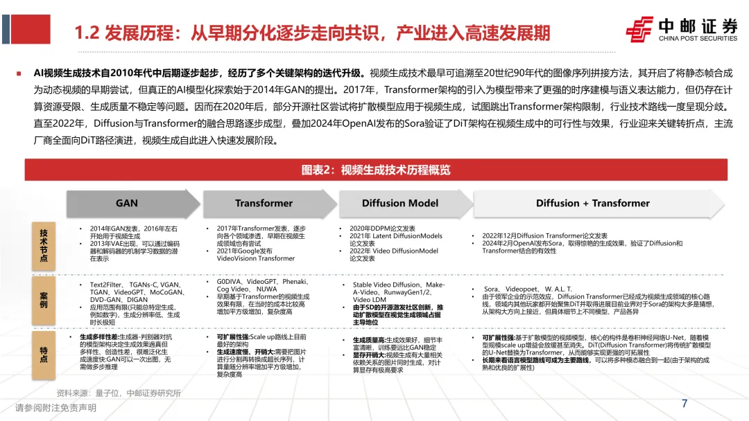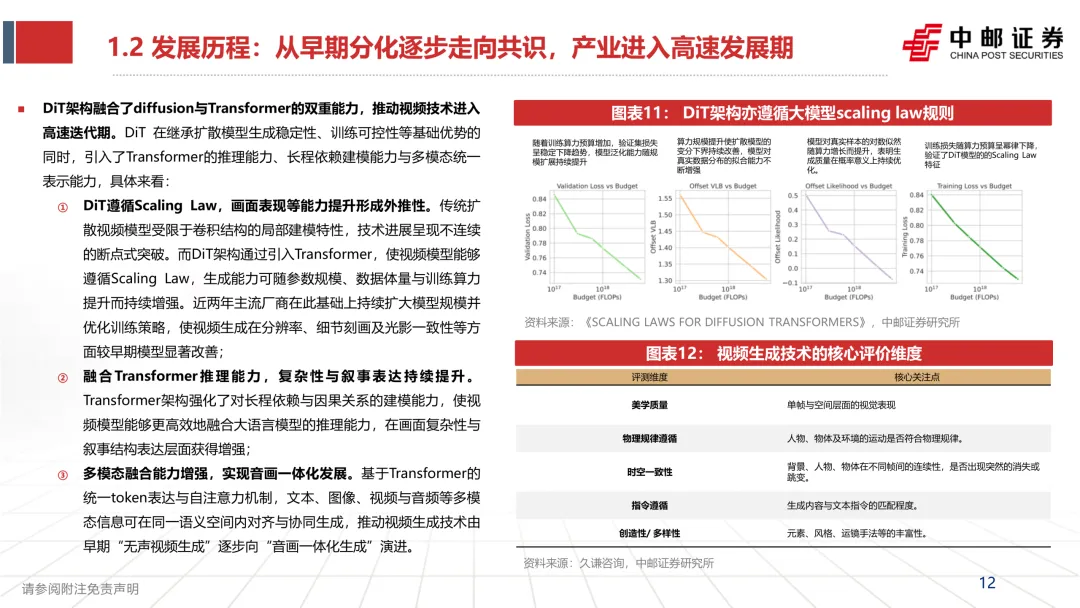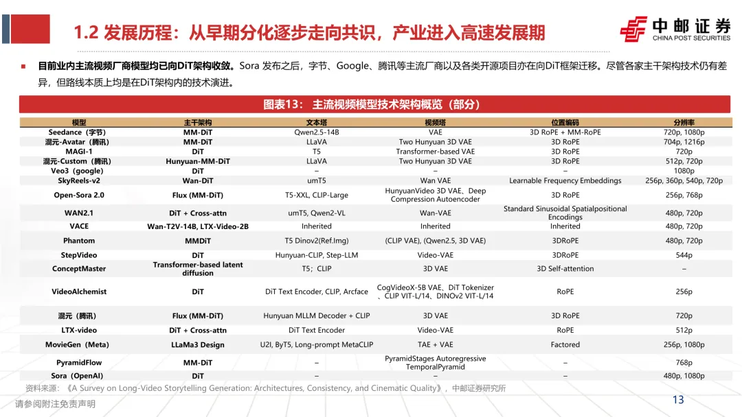 主流厂商开始集体向 DiT 路径演进,行业进入快速发展阶段。