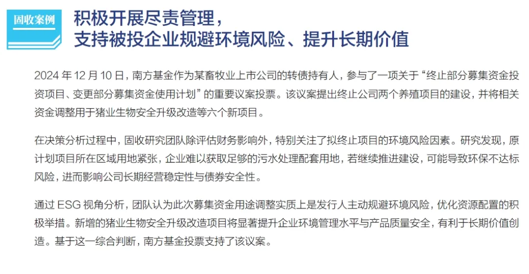 从目标导向看,南方基金将尽责管理价值聚焦于“客户”与“企业”双维度,形成良性互动。一方面,坚持“持有人利益优先”原则,将尽责管理作为提升投资组合韧性的关键手段,通过识别被投企业的ESG风险与机遇,力求提升客户的长期投资体验;另一方面,通过建设性对话与治理参与,助力企业向增强可持续发展能力。其“价值共创”的定位既有效降低治理协作的沟通成本,也切实推动企业契合国家绿色低碳、合规经营的发展方向,助力其长期价值的提升。