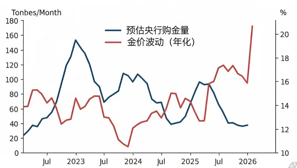 2025 年 12 月央行黄金购买量为 22 吨,12 个月平均购买量为 52 吨,央行购金需求的放缓已直观体现在数据层面。