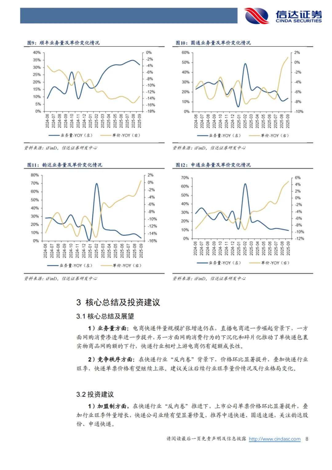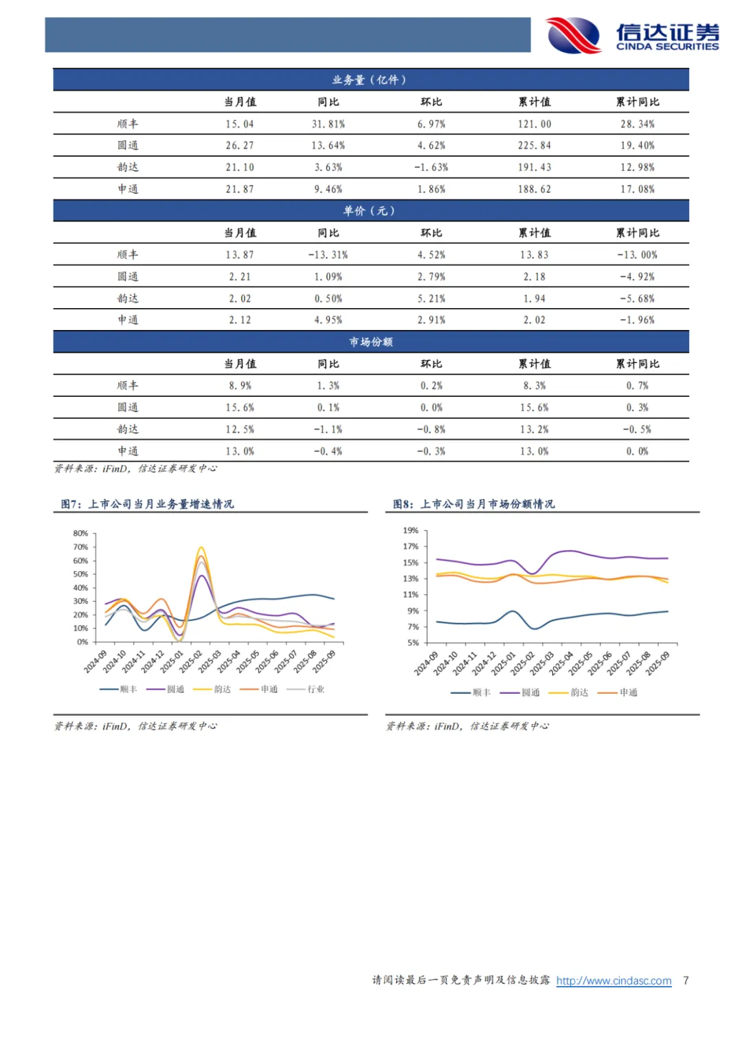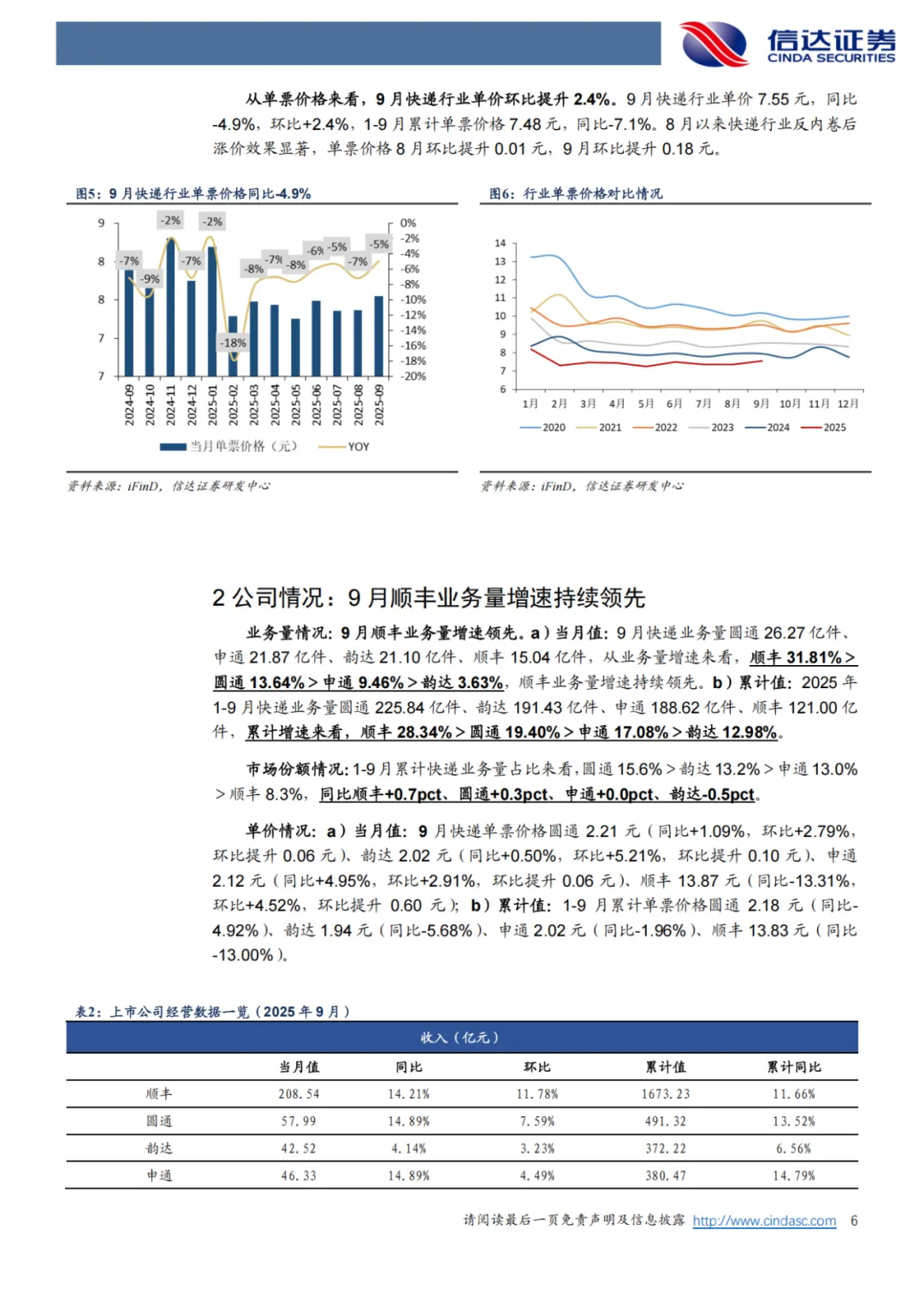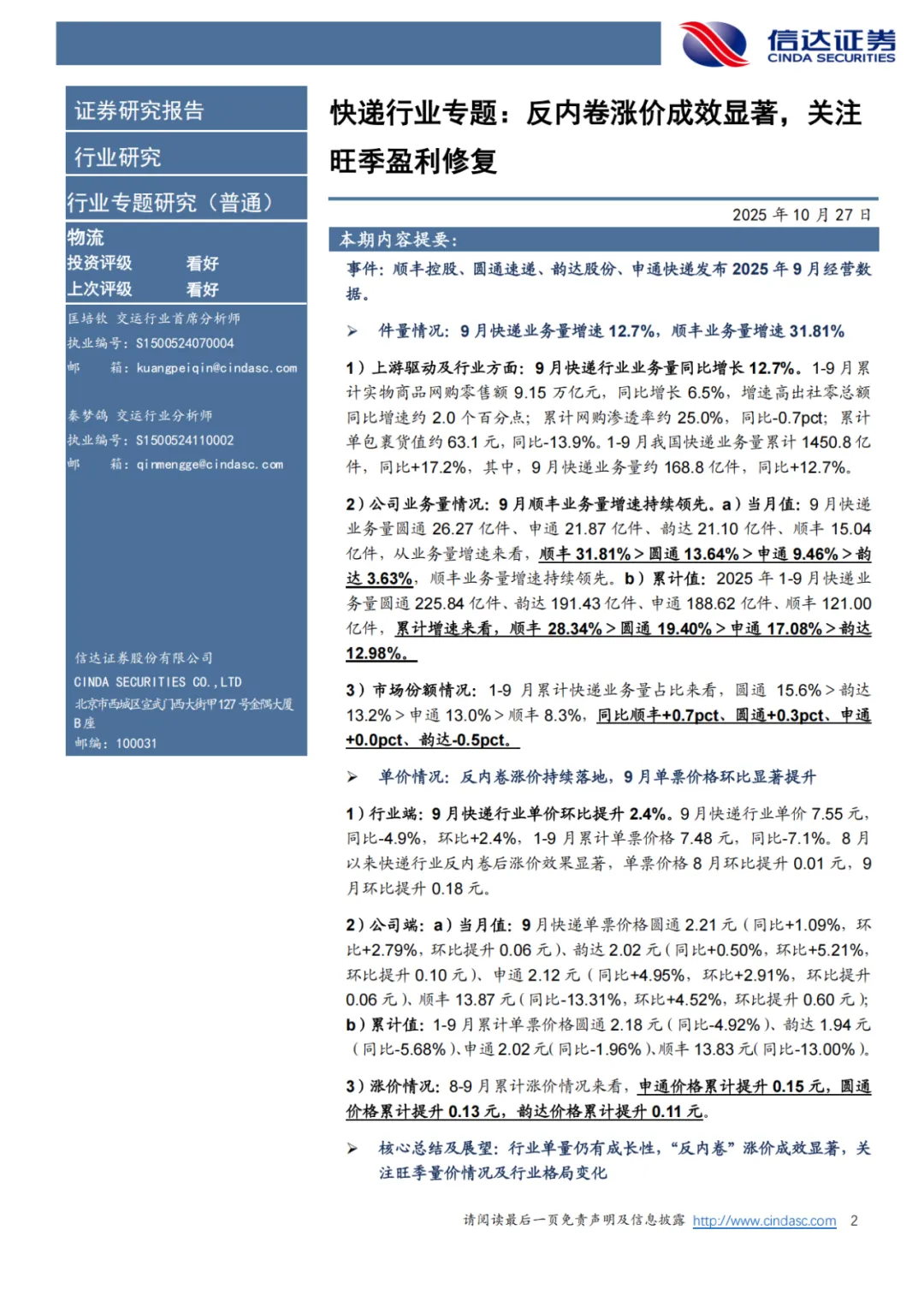 【研报:快递反内卷涨价成效显著】单价情况:反内卷涨价持续落地,9 月单票价格环比显著提升来源/信达证券作者/匡培钦,秦梦鸽来源/信达证券作者/匡培钦,秦梦鸽⊙文章内容为作者独立观点,不代表物流指闻立场,转载此文章需经作者同意,同时注明作者姓名及来源。如有异议、建议或合作需求,请联系微信logvip56中国物流领域更具影响力的新媒体平台精准影响386万物流人群我们期待各位物流人与我们互动,不要吝啬你的建议与意见。黄刚老师深入交流加微信:huanggang36商务合作、爆料、投稿加微信:logvip56猎头、跳槽、招聘服务加:headscmhrv物流商情合作加微信:wuliushangqing注:加微信请备注“公司+职位”,非诚勿扰↓↓↓更多信息请点击“阅读原文”