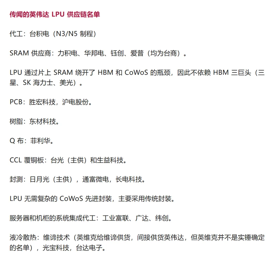 2️⃣未来重大催化3月英伟达GTC大会:a)#定位于AI推理需求场景的LPU,将大容量SRAM和GPU做一体化封装,为适配“高带宽低时延”的要求,PCB亦将配套升级,或将采用M9等级材料以及更高层数的多层板设计。考虑到未来AI推理需求的市场空间远大于训练侧,LPU将成为AI PCB一大新增市场;b)Rubin Ultra架构的进一步优化升级,正交背板方案仍在持续推进;c)下一代Feynman芯片以及新的算力架构的展示。