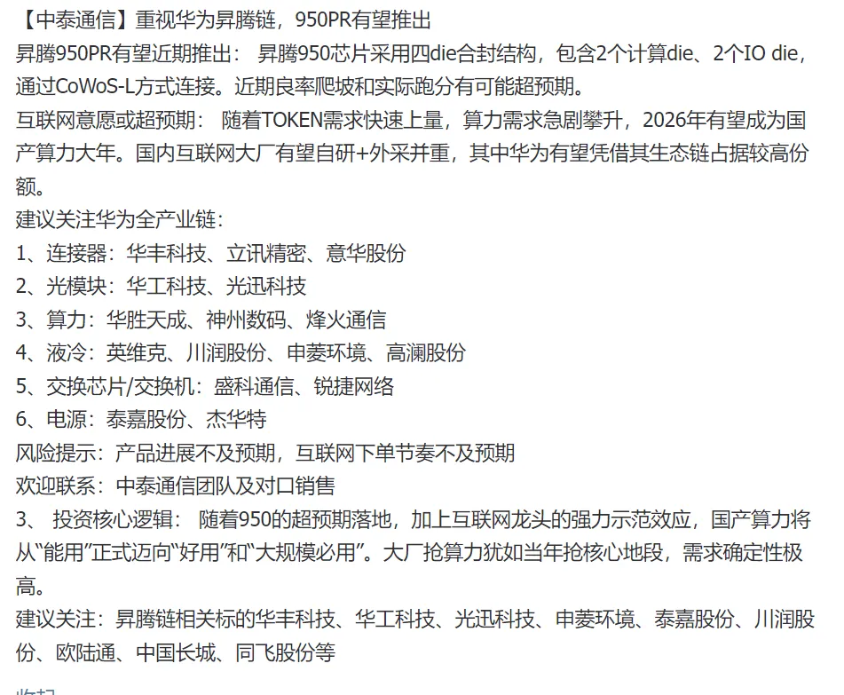 相关标的:海光信息、禾盛新材等;CPU上游:华正新材、呈和科技、宏和科技、延江股份等;服务器:中科曙光、浪潮信息、紫光股份;虚拟化:优刻得、首都在线、青云科技等;原厂:美光、海力士等;模组:闪迪、香农芯创、开普云、德明利等;芯片:帝科股份等;设备&封测材料等:雅克科技、佰维存储、长电科技、华源控股等。