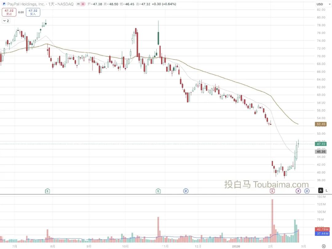 • L1 现象 (What):2026年 2月 24日前后,PayPal 股价在盘中爆发出罕见的单日暴涨,涨幅一度逼近 10.0%,最终收涨约 6.7% 至 47.02美元。更为关键的是,当日成交量急剧放大至 7530.0万股,是其过去三个月平均成交量(2180.0万股)的 3.5 倍以上。 • L2 归因 (Why):宏观层面上,10Y 美债收益率在 4.0% 关口的企稳,消除了成长股估值进一步坍塌的系统性风险;微观生态上,Stripe 的收购意向以及新任首席执行官 Enrique Lores(曾主导惠普分拆的并购老手)的走马上任,直接引爆了市场对 PayPal 被整体收购或分拆出售的强烈预期。 • L3 影响 (So What):这对未来意味着 PayPal 的定价逻辑发生了根本性反转。在此之前,市场使用线性市盈率来惩罚其不断放缓的营收增速;而现在,定价权被强行切换为基于并购预期的分部加总估值体系。只要这股由 Stripe 释放的血腥味没有彻底消散,股价的下行空间就被潜在的收购底价彻底封死,从而为右侧交易者提供了一个向下空间有限、向上极具弹性的绝佳盈亏比模型。
