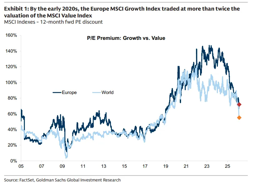 在欧洲,成长因子的交易价格比价值因子高出约150%——这反映了市场将许多短久期的"旧经济"公司视为结构性价值陷阱。