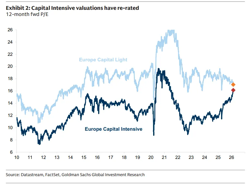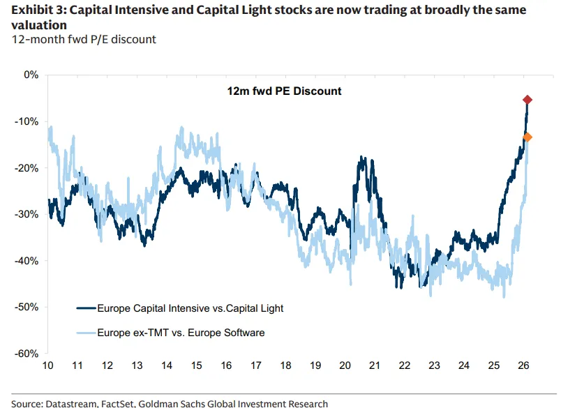 资本密集与资本轻之间的估值差距已大幅缩小。随着投资者重新定价韧性和实体经济资产的战略价值,这两个篮子目前的交易估值几乎持平。
