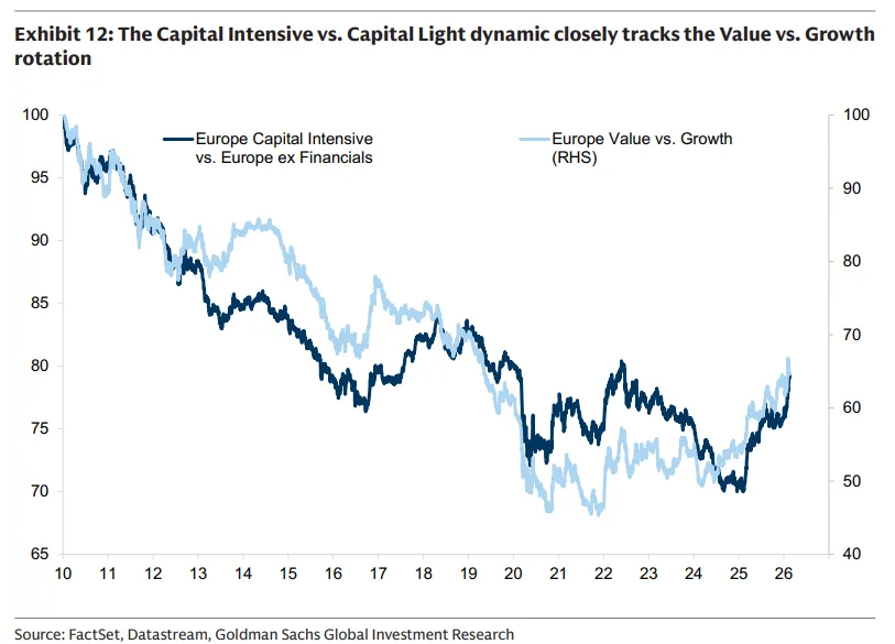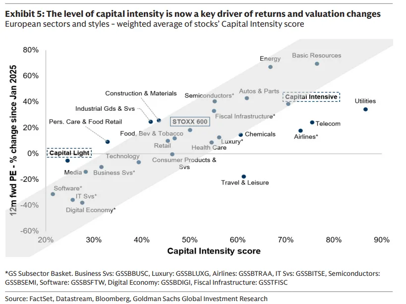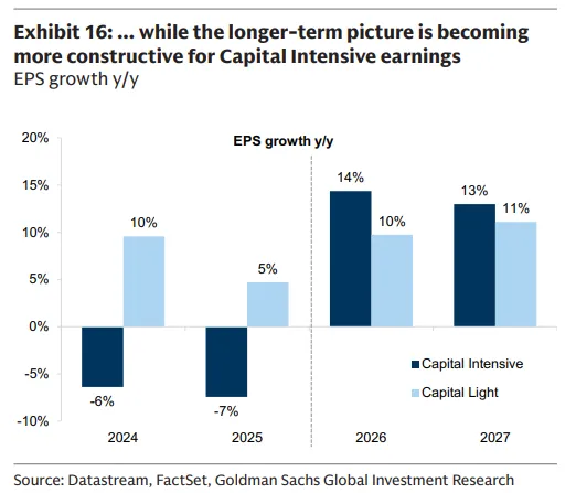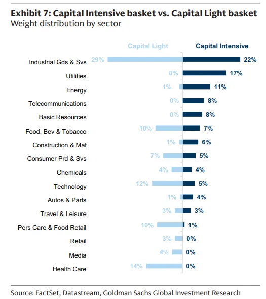 自2025年以来,我们新构建的资本密集篮子(GSSTCAPI)表现优于资本轻篮子(GSSTCAPL)35%,资产强度正成为估值和回报的关键驱动因素。