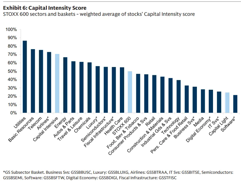 资本密集篮子(GSSTCAPI)包括来自公用事业、能源、基础资源和工业的预期名称,但也包括更广泛的公司,涵盖航空航天与国防、运输、长周期工业、奢侈品和特定消费子行业(图表7)。其资本强度得分使其位于STOXX 600指数的第75个百分位左右。