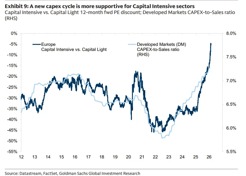 财政扩张、更高的重置成本、区域化再平衡和制造业反弹都支持资本密集型行业。在欧洲,资本支出与销售额之比处于十年高位,扭转了长达十年的投资不足局面。