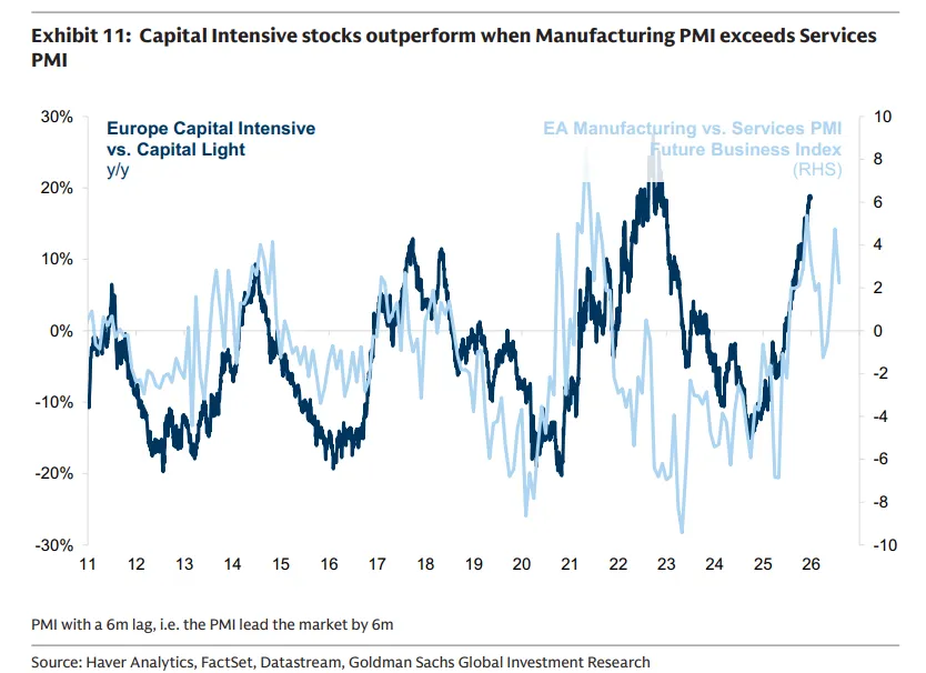 当制造业PMI超过服务业PMI时,尤其是未来商业预期分项上升时,资本密集型股票表现更好。由于资本密集型行业与工业生产、资本支出周期和实物产出密切相关,它们对制造业前景的改善反应更积极。随着制造业PMI近期重新回到服务业之上(至少未来商业预期分项如此),宏观背景再次转向有利于资本密集型行业(图表11)。