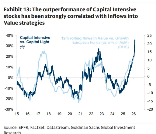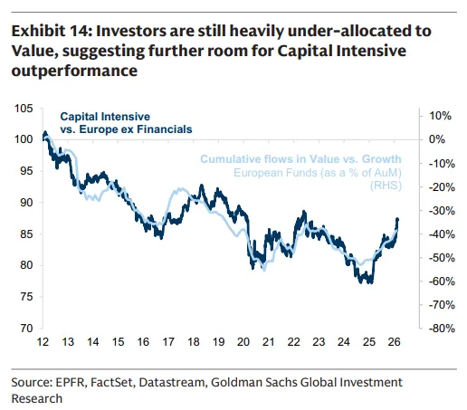 资金强劲流入价值策略,以及希望分散过度拥挤的美国科技股敞口,都在强化向资本密集型的轮动,然而长期配置仍远未达到过度水平。
