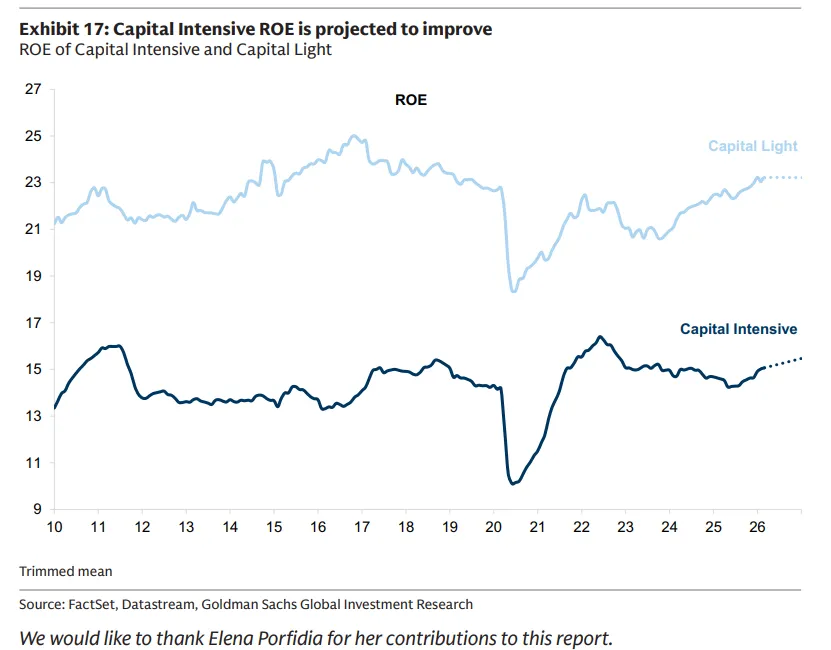 市场一致预期现在预计资本密集型公司的每股盈利增长更快,净资产收益率将提高,而资本轻公司的净资产收益率预计将持平——这引发了对这一群体长期享有的溢价是否可持续的疑问。