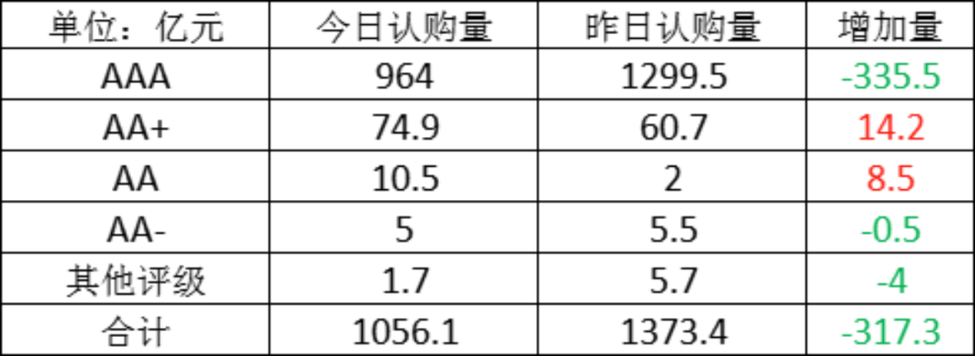 今日存单认购量规模1056.1亿元,较上一工作日认购量有所减少,减少了317.3亿元。