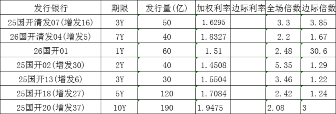 今日国家开发银行发行3年政策性金融债,发行量30亿元,发行利率1.5504%,投标倍数3.46倍,边际倍数1.22倍;国家开发银行发行5年政策性金融债,发行量120亿元,发行利率1.7084%,投标倍数2.42倍,边际倍数1.24倍;国家开发银行发行10年政策性金融债,发行量190亿元,发行利率1.9475%,投标倍数2.08倍,边际倍数3倍。