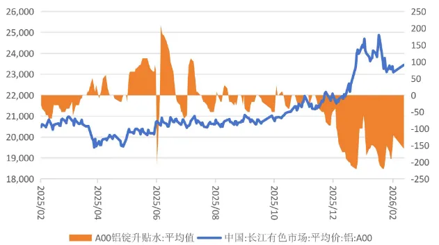 截至 2 月 24 日收盘,沪铝主力合约 AL2603 收盘价为 23550 元/吨,较上一日+1.53%。持仓量为 127637 手,较上一日-14862 手。长江有色现货 A00 铝报均价 23400 元/吨,较上一日+240 元/吨,升贴水平均价为-160。