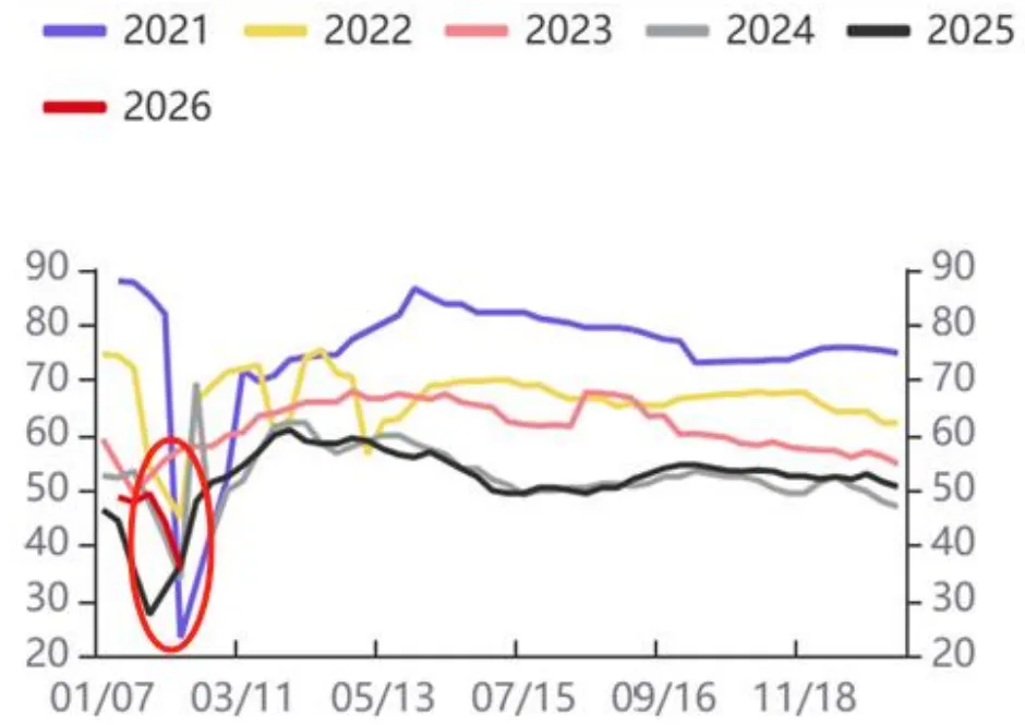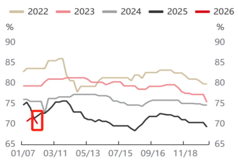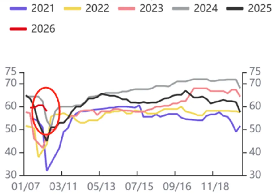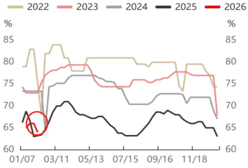 下游需求进入淡季,电解铝下游加工企业开工率整体有所下滑,进入26年,叠加高铝价抑制下游接货需求以及临近春节放假,开工率继续下滑。