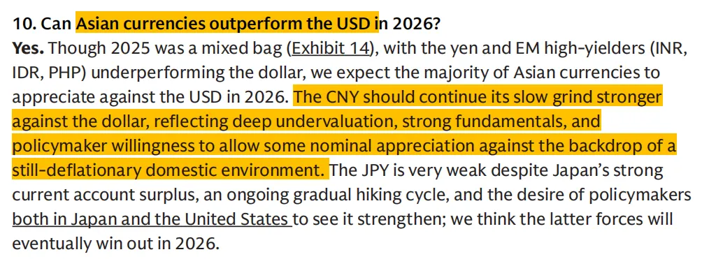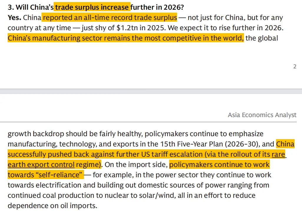 中国GDP增长4.8%,高于市场普遍预期的4.5%-4.6%,主因出口增长与财政政策支持; 一线城市有望企稳,但全国范围内新开工和房价仍承压,整体尚未见底; 贸易顺差可能继续扩大,得益于工业竞争力、“十五五规划”对科技与出口的重视,以及通过稀土管控对冲关税压力。同时,能源等领域进口依赖度下降。 其他涉及中国三个问题: 关税有望从特朗普访华受益; 预计继续执行财政适度宽松政策; 人民币有望继续增值。