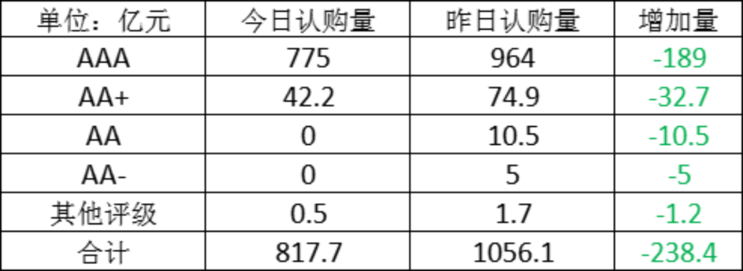 今日存单认购量规模817.7亿元,较上一工作日认购量有所减少,减少了238.4亿元。